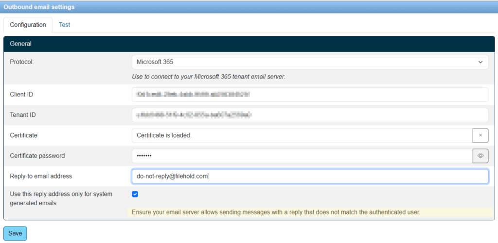 FileHold Cloud customers do not need to configure outbound email settings as we have provided you a default configuration. You can upgrade this default configuration to use your normal company email domain and to enable using the built-in email client for sending email direct from users. Contact for more information. You can also configure your own email server. Our professional services team can assist you if you need help to get your own email server configured.