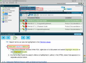 For the desktop client (FDA), there is one additional button: Highlight Results. This button is enabled when a document is selected and will let a user see how specific text from any full text search criteria is related to the file contents. Press Highlight Results and a simple viewer will open with words highlighted in yellow where there was a match to the search.